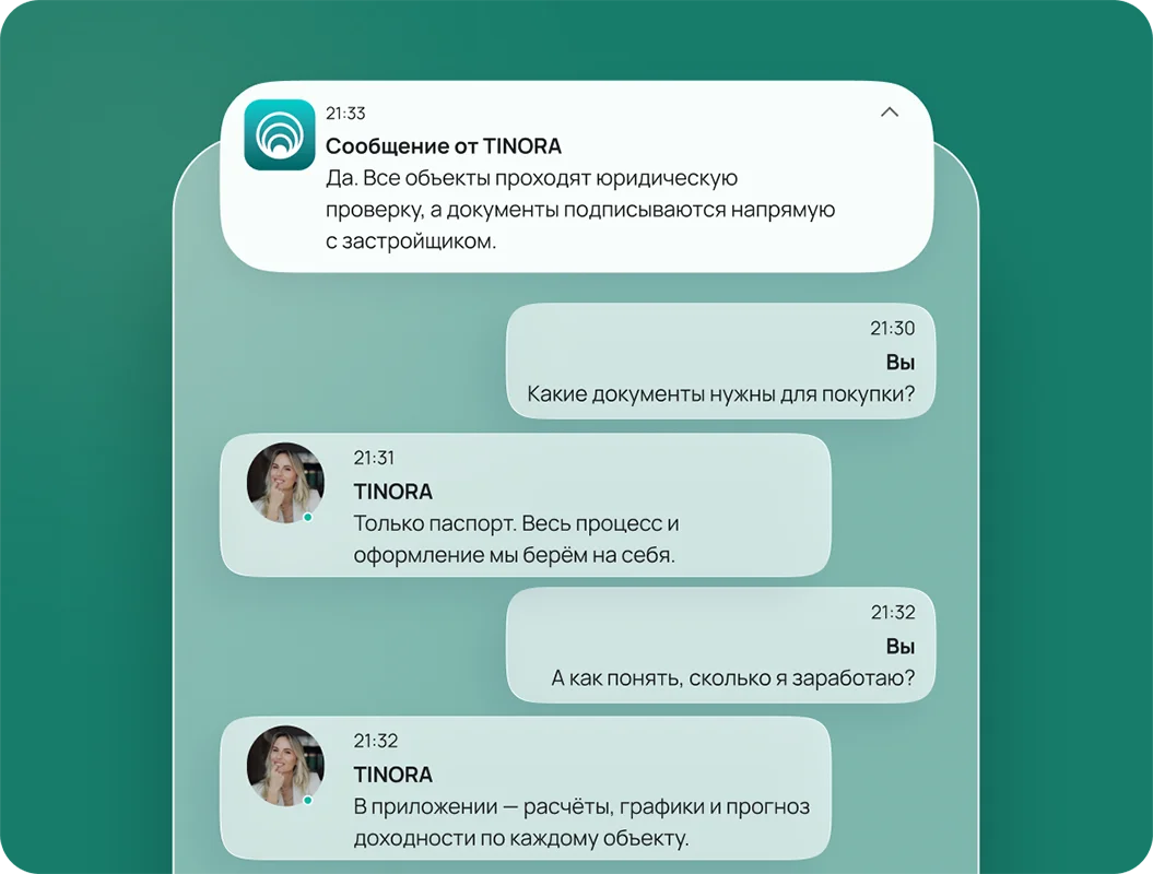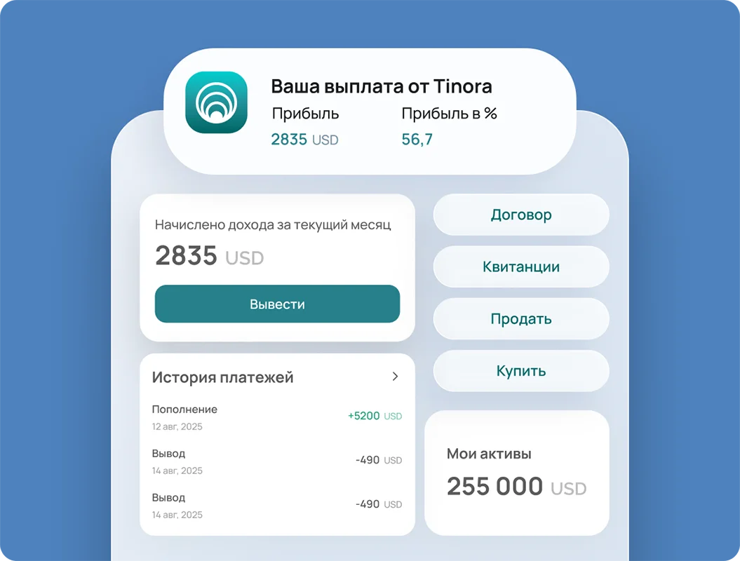 Все этапы, документы и аналитика — в приложении TINORA: личный кабинет, статус сделок, отчёты и связь с экспертами — в один клик.